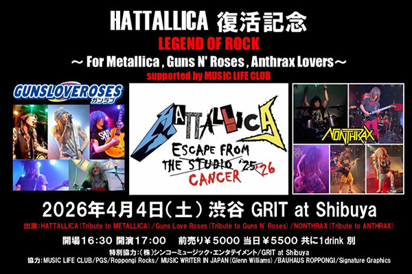 HATTALLICA復活記念! メタリカ、ガンズ、アンスラックスのトリビュート・バンドが出演する “LEGEND OF ROCK” を4月4日(土)渋谷GRITにて開催!