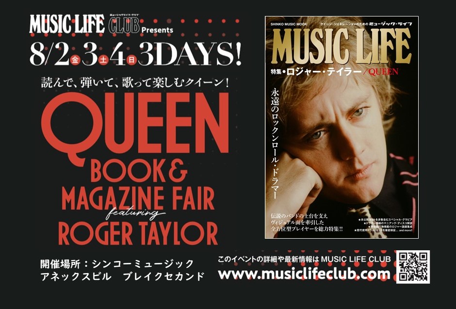 8月2日から8月4日までの3日間、シンコー・ミュージックのイベントスペース“ブレイクセカンド”にて、「QUEEN BOOKS & MAGAZINE FAIR featuring ROGER TAYLOR」を開催します。