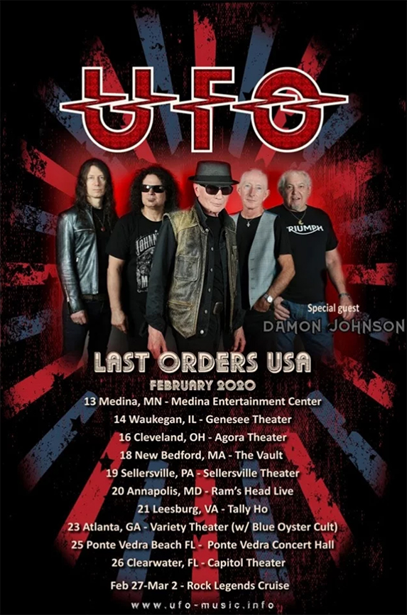 英ロック・バンドのUFOが今年3月から乗り出した結成50周年記念ワールド・ツアー「Last Orders」は、11月2日に北米ツアーを終えたばかりですが、2020年2月に行なわれる新たな北米ツアーの日程と、2月27日から3月2日に開催される「ロック・レジェンド・クルーズ(Rock Legends Cruise)」への出演が発表されています。