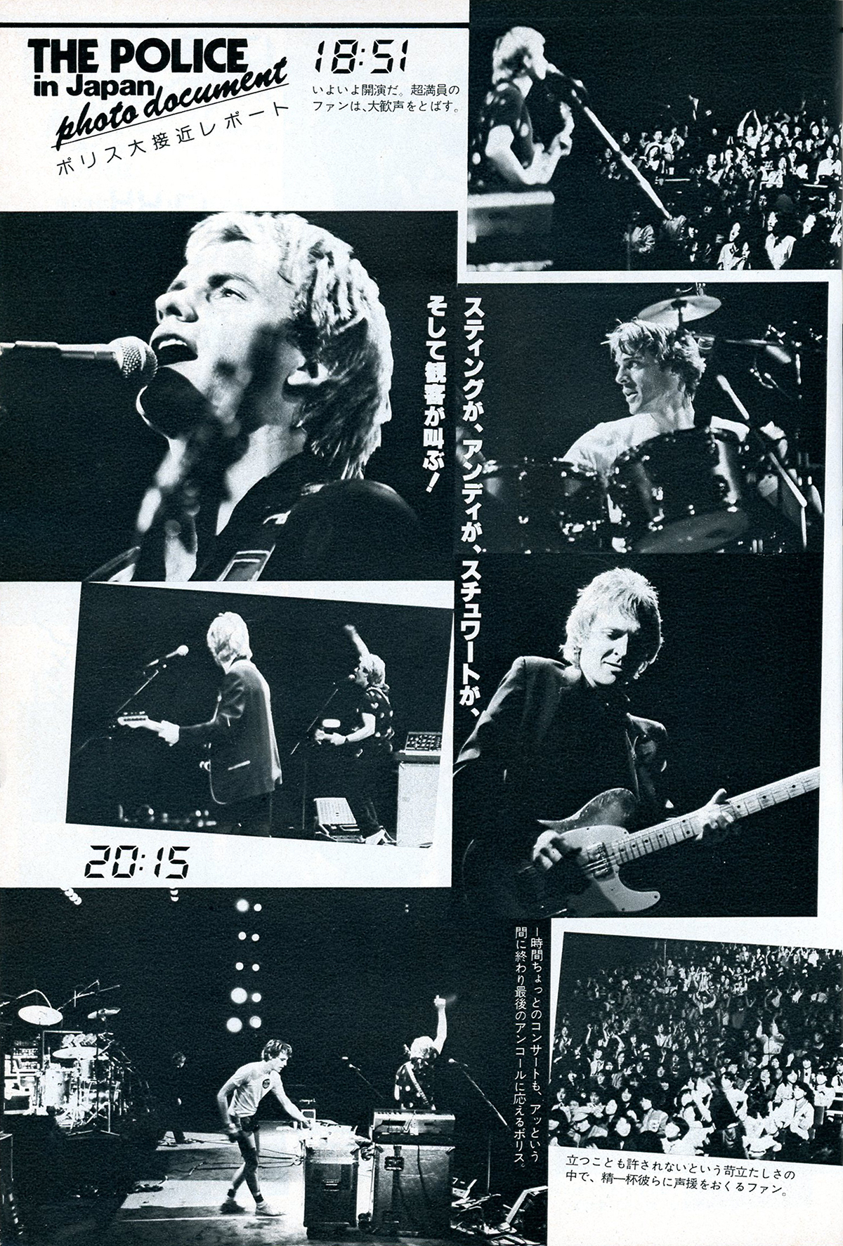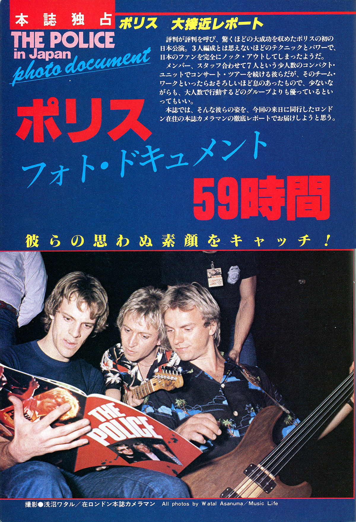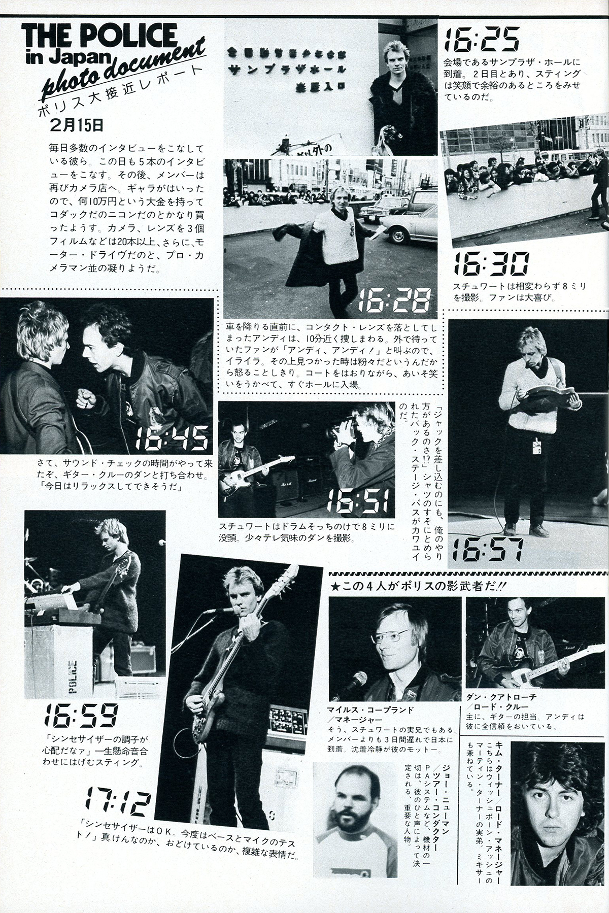 先週まで全3回にわたって短期集中連載としてお送りしてきた「今だから語るポリス、1980年の日本ツアー」。レコード会社スタッフ/専属カメラマンとして同行していた肥田慶子、浅沼ワタル両氏による対談は先週分までで、本来ならそこで終了の予定でしたが── “ボーナス・トラック” として、同日本ツアーに密着し分刻みでその動向を伝えた『ミュージック・ライフ』1980年4月号掲載の同記事「ポリス/フォト・ドキュメント59時間」を再録(撮影は一部を除きすべて浅沼氏)。42年前を思い出しつつ、映像作品『アラウンド・ザ・ワールド』を今一度お楽しみください。