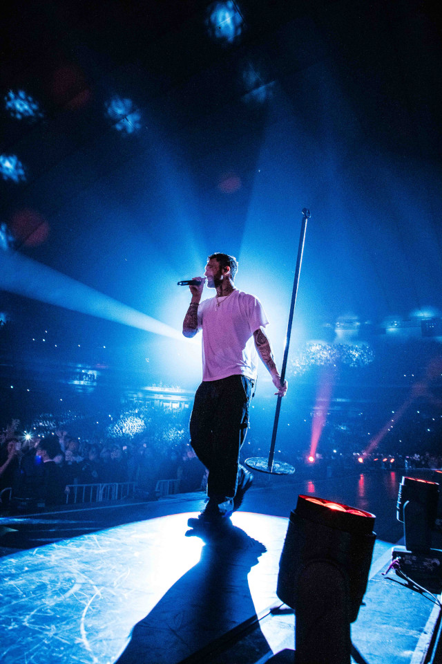そこからアダム・レヴィーンが参加したジム・クラス・ヒーローズの「Stereo Hearts」「One More Night」「Animals」が続く。しかもノンストップで、ライティングを演出に使いながら、巧みなアレンジで流れるように次の曲に展開していく。観客の興奮を途切れさせない編成というか、ドラマの録画を倍速で観る世代を意識してのものか、ほとんどMCもなく、メンバー紹介すら曲の合間にサラリと終わり、バンドのライヴでよくあるソロ演奏の長い見せ場もない。