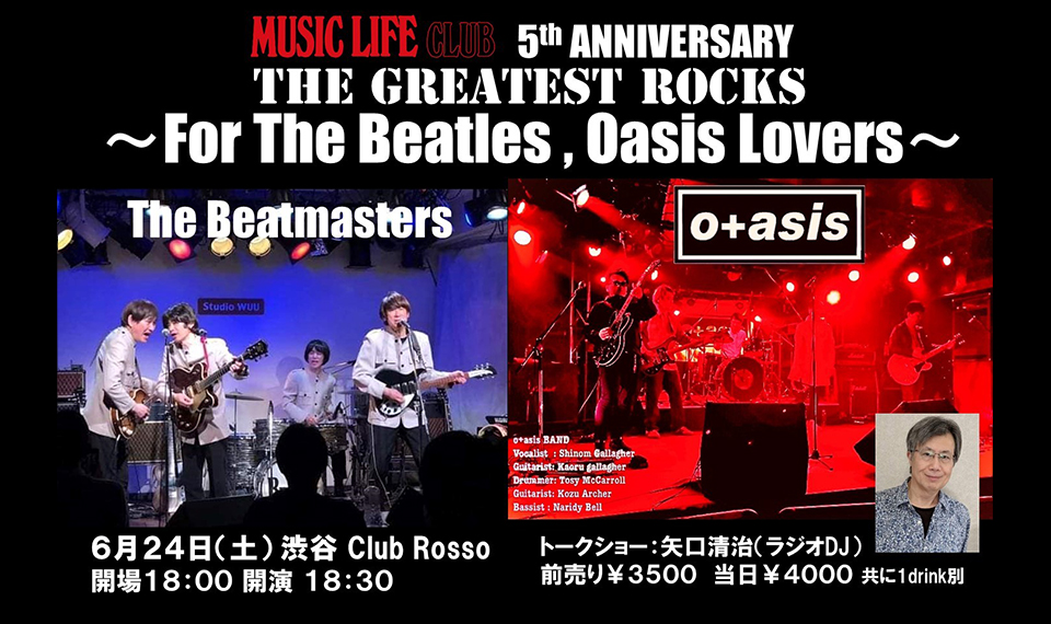 MUSIC LIFE CLUBの5周年を記念して行なわれるレジェンド・アーティストのトリビュート・ライヴ&トーク・イベント “The Greatest Rocks”。6月24日(土)渋谷Rossoでは、ビートルズ来日記念月間にちなんで~For The Beatles,Oasis Lovers~ということで、ザ・ビートルズと彼らに大きな影響を受けたことを公言しているオアシスの2大ブリティッシュ・バンドのトリビュート・ライヴ&トークが行なわれます。