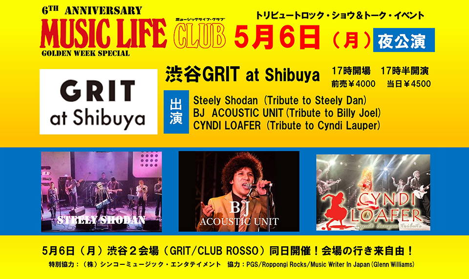 MUSIC LIFE CLUBは6周年を祝うトリビュート・ライヴ・イベント、ゴールデン・ウィーク・スペシャルの最終日の5月6日(月・祝)は、渋谷のライヴハウスCLUB ROSSO(昼公演)とGRIT at Shibuya(夜公演)の 2会場で開催いたします。
