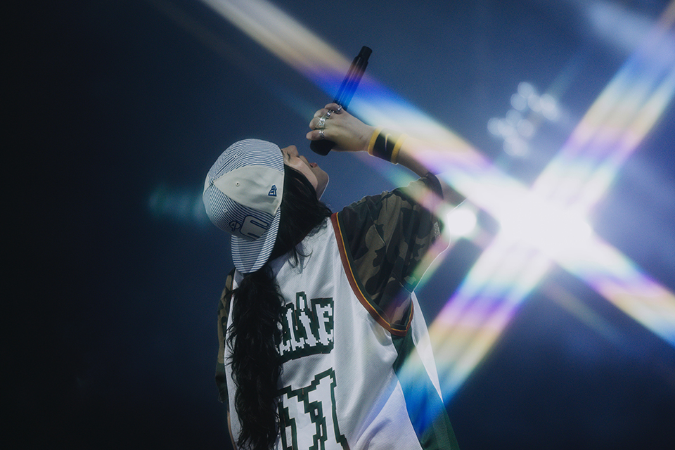 続いて「東京(=日本)のみんな、元気?」と軽く挨拶をし、最新作から「LUNCH」をパフォーマンスすると、ビリーは広いステージを全力疾走。観客と一緒に、この空間を全身全霊で楽しもうという姿勢がうかがえたのだった。その後「NDA」など、アップテンポな楽曲を披露し終えると、ビリーは改めて会場に訪れたファンとの貴重な時間を噛み締めている様子。30秒以上も歓声を受け止め(途中でうれしさのあまり笑顔がこぼれる場面も)、「改めて日本でライヴができることがうれしい、今日は楽しんで!」と絶叫し、アルバムから美しくもはかないメロディが印象的な「WILDFLOWER」を熱唱し終えると、「ほかの楽曲では自由に歌って叫んでいいから、この1分間だけは静かに耳を傾けて」とオーディエンスに呼びかけ、デビュー盤に収録された「when the party's over」をパフォーマンス。すると、会場は一瞬にして静まりかえり(海外ではなかなかそういう瞬間はなかったよう)、代わりに会場がスマホや携帯電話の光に包まれるなか、ビリーは胡座をかき、まるで禅の世界に没入したような、イノセントな雰囲気を漂わせていた。