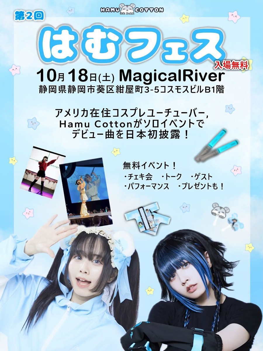 日本生まれ・アメリカ育ちで南カリフォルニアを拠点とするSNS総フォロワー数約50万人を誇るコスプレイヤー兼YouTuber、Hamu Cotton(はむこっとん)は、先日はアメリカ最大のアニメフェス『Anime Expo®️』のステージでパフォーマンス! 今回は、自らショーの運営も手がけるイベント『はむフェス』の日本開催第2回目。たくさんのHamustars(はむスター:ファン)のご来場をお待ちしてます! 入場無料!!