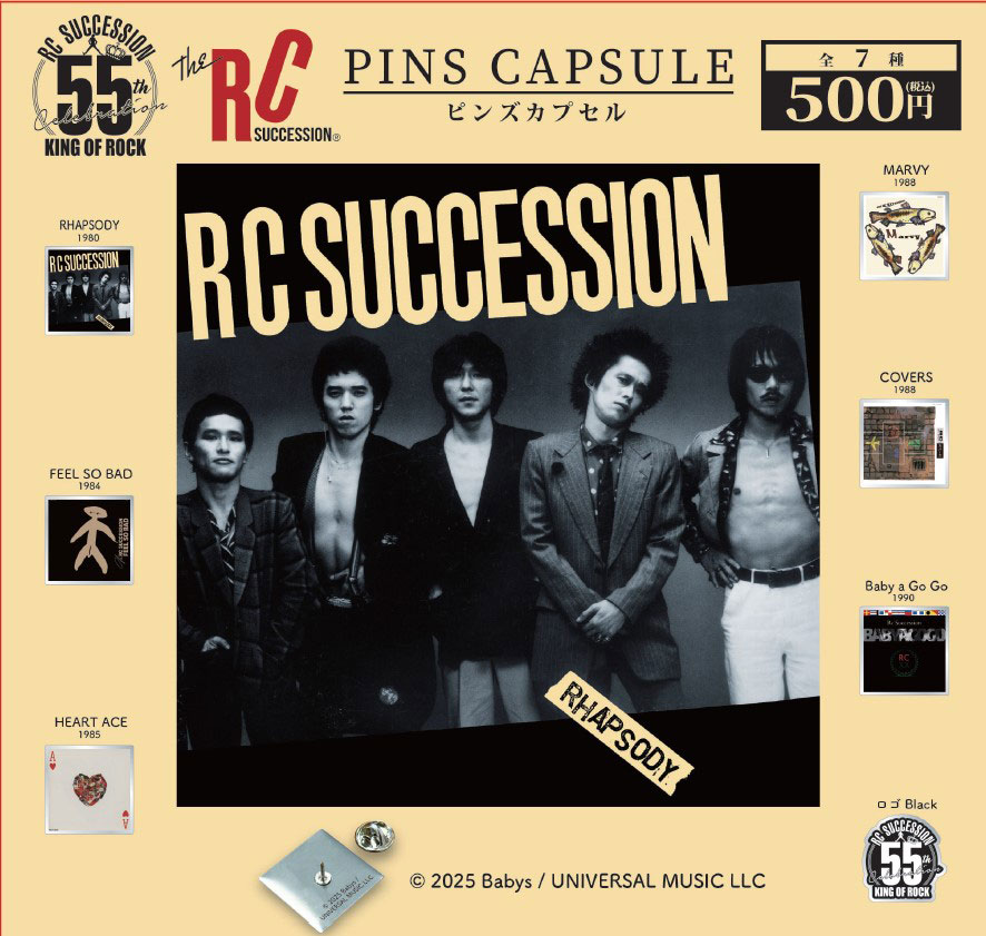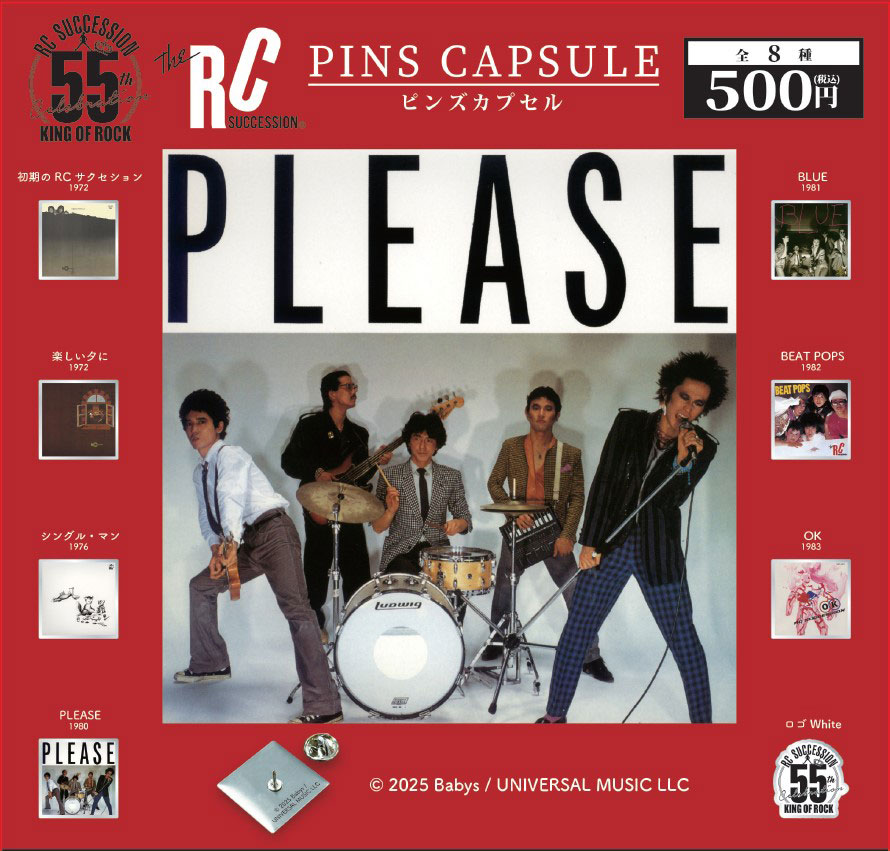 今回発売するカプセルトイは、厳選した「RC サクセション」のアルバムジャケットや、55周年ロゴをデザインしたピンバッジ(ピンズ)が専用台紙と共にカプセル内に収納されており、コレクションにも最適です。ぜひ、この機会にお買い求めください!