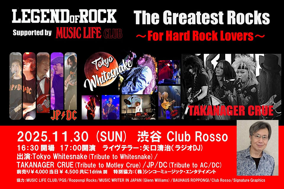 トリビュート・ロック・ショウ&トークタイムで楽しむLEGEND OF ROCK。11月30日(日)は、ハードロック・ファン待望の “The Greatest Rocks〜For Hard Rock Lovers〜” が渋谷 Club Rossoで開催されます。
