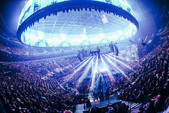 SOLD OUTとなったIntuit Domeの会場内には、『METAL FORTH』のアルバムジャケットのデザインにもなっている菱形のブラックホールを形どったセンターステージが設置され、エンドステージ側にはブラックホールが浮かび上がる巨大なMETAL FORTHの空間が広がっていた。さらにはステージおよび会場全体を360度囲むようなHALOと呼ばれるリング状の巨大なLEDスクリーンが天井から吊るされており、今回のスペシャルな公演に期待が高まる。