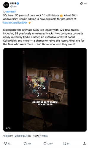 KISSが1975年にリリースした初ライヴ・アルバム『Alive!』(邦題『地獄の狂獣キッス・ライヴ』)が、11月21日に50周年記念スーパー・デラックス・ボックスセットとして発売されることになりました。