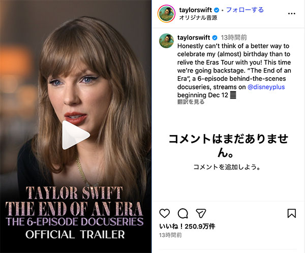 また12月12日には、新コンサート映画『Taylor Swift: The Eras Tour – The Final Show』もDisney+で初公開される予定で、こちらの映画には、2024年12月8日にバンクーバーのBCプレイスで行った同ツアーの最終公演がフル収録されています。