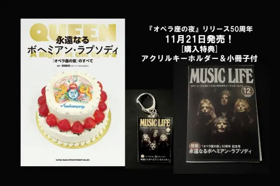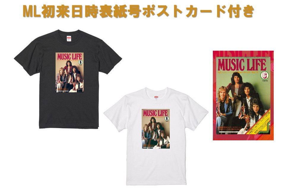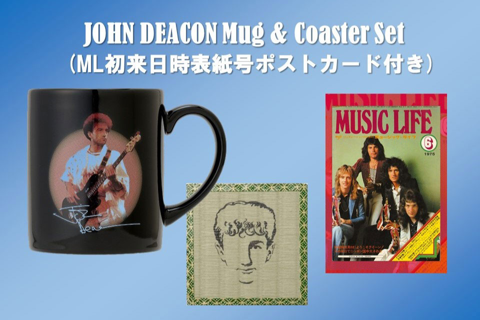 クイーンが表紙を飾ったMUSIC LIFE 1975年6月号の柄をプリントしたTシャツ2種(黒/白)、ジョン・ディーコンのマグカップと畳コースターのお得なセットにしたお得な商品がラインナップ。