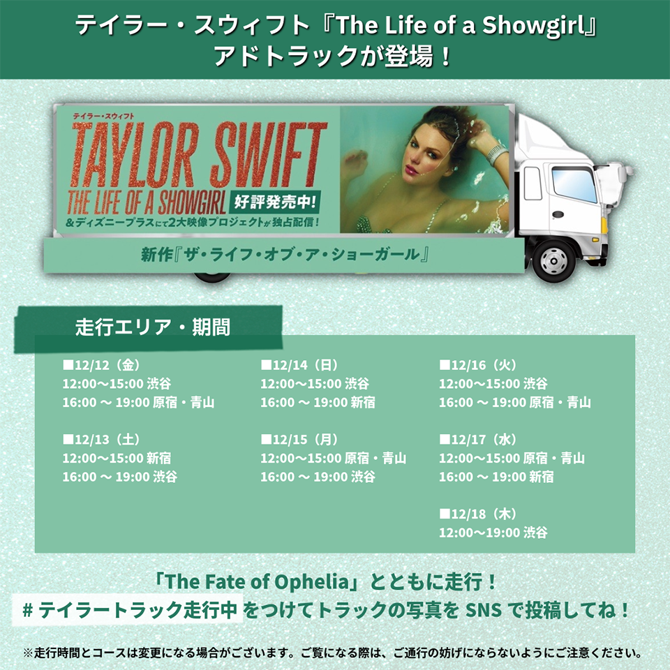 さらに、本日よりディズニープラスにて「The Eras Tour」最終公演を収めたコンサート映画『Taylor Swift | The Eras Tour | The Final Show』と、舞台裏に迫る全6話のドキュメンタリーシリーズ『The End of an Era』の独占配信も予定されている。国内盤の発売、ディズニープラスでの配信、12月13日のテイラーの誕生日を記念して、本日より1週間テイラーのアドトラックが都内各地を走行することも明らかになっている。
