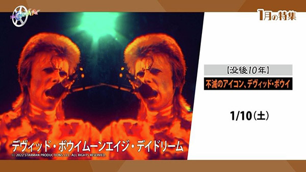 スカパー!、J:COMほか全国のケーブルテレビ局、ひかりTV、auひかり等の映像配信サービスで視聴できる日本唯一の洋画専門チャンネル「ザ・シネマ」では、1月10日に没後10年を迎えるデヴィッド・ボウイ特集を予定。視聴可能な方はボウイを偲び、命日にぜひご覧ください。