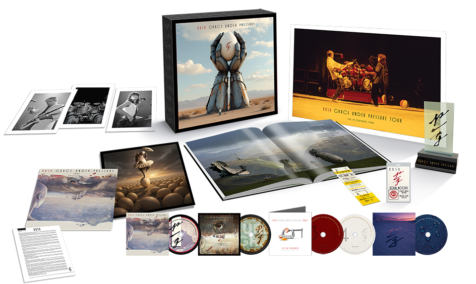 また、『グレイス・アンダー・プレッシャー』のスーパー・デラックス・エディションには、ゲディ・リーが執筆した新たなライナーノーツも掲載。本アルバムの制作に際して行なった新プロデューサー探しの記憶を辿るともに、先頃改めて聴き直したこのアルバム本編についての思い出話が綴られている。オリジナル・アルバムのデザイナーを務めたヒュー・サイムは、オリジナル・アルバム・ジャケットを再解釈しているのに加え、全8曲の収録曲それぞれのための新規イラストや、同梱ブックに掲載するその他の関連ビジュアル要素を新たに制作。ボックスセット限定の特典グッズには、特注アクリル製『グレイス・アンダー・プレッシャー』LED発光ディスプレイや、同ツアー・ブックの複製、メープルリーフ・ガーデンズ/トロント公演チケットのレプリカ、『グレイス・アンダー・プレッシャー』ツアーの全エリア・アクセス・バックステージパス、全6頁の報道資料「プレッシャー・リリース」の複製、バンド・メンバー3人のライヴ写真リトグラフ、そしてトロント公演のポスターが含まれており、この全てが高品質の蓋付き収納ボックスに格納される形だ。