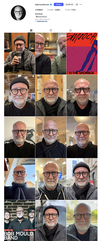 ※左画像はボブ・モールド公式インスタグラム。投稿は日々の短いメッセージと、時折最新情報などが挟み込まれるものの、ほぼ同じ距離+真正面からのセルフィー画像のみ!(しかも本人の表情も、無表情〜控えめな笑顔)。どこまで下にスクロールしても同じ、そしてフェイスブック、スレッズも同内容。