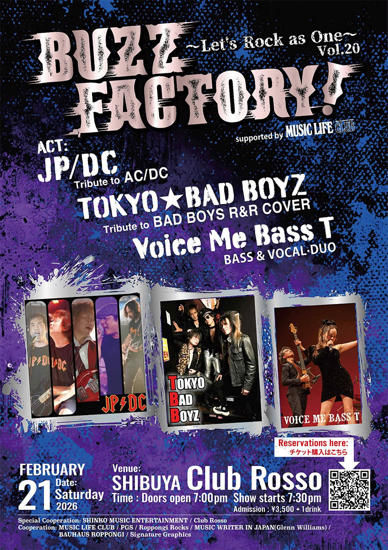 国籍・年齢・性別の違いを取り払って“ROCK” を楽しむことをコンセプトにした、インディーズ・バンドを応援するイベント、“Buzz Factory!~Let's Rock as One~Vol.20” が2月21日(土)に開催されます。今回は定番の六本木ではなく渋谷にて開催!
