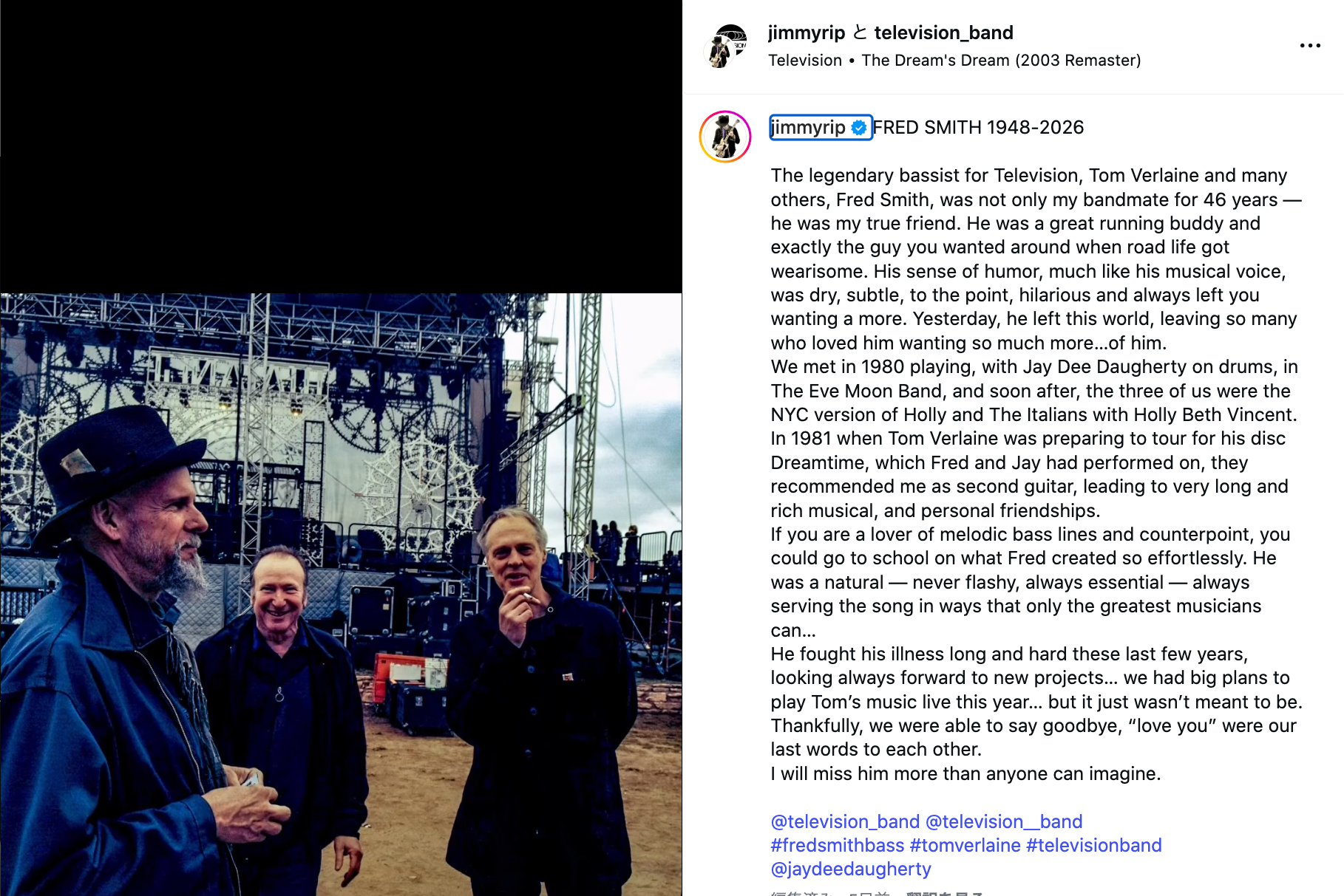 テレヴィジョンのギタリストであるジミー・リップも、Instagramでスミスを追悼するコメントを以下のように発しています。