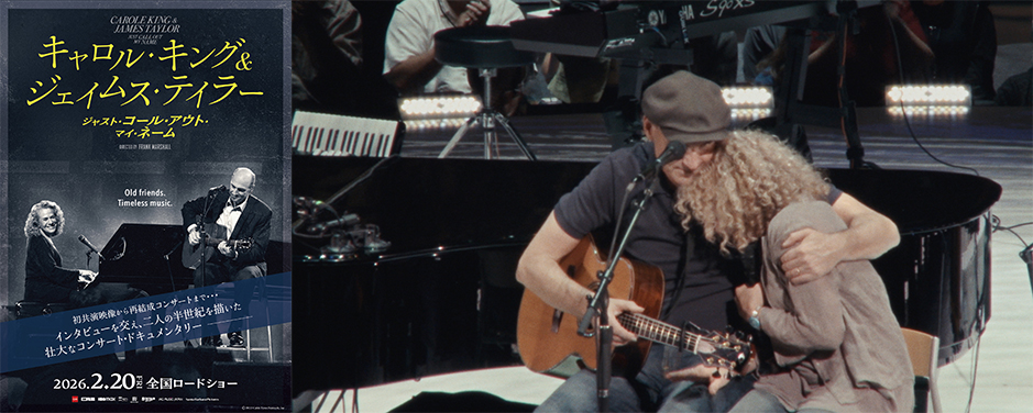 米ポピュラー音楽界の至宝2人の歴史的再共演ライヴの映画『キャロル・キング&ジェイムス・テイラー:ジャスト・コール・アウト・マイ・ネーム』は2月20日(金)YEBISU GARDEN CINEMA/新宿ピカデリー/TOHOシネマズ日本橋を始め、全国劇場にて順次公開される。また、2月22日(日)YEBISU GARDEN CINEMAでは朝日順子、ジョージ・カックルのふたりが登壇してトーク・イベントが開かれる。