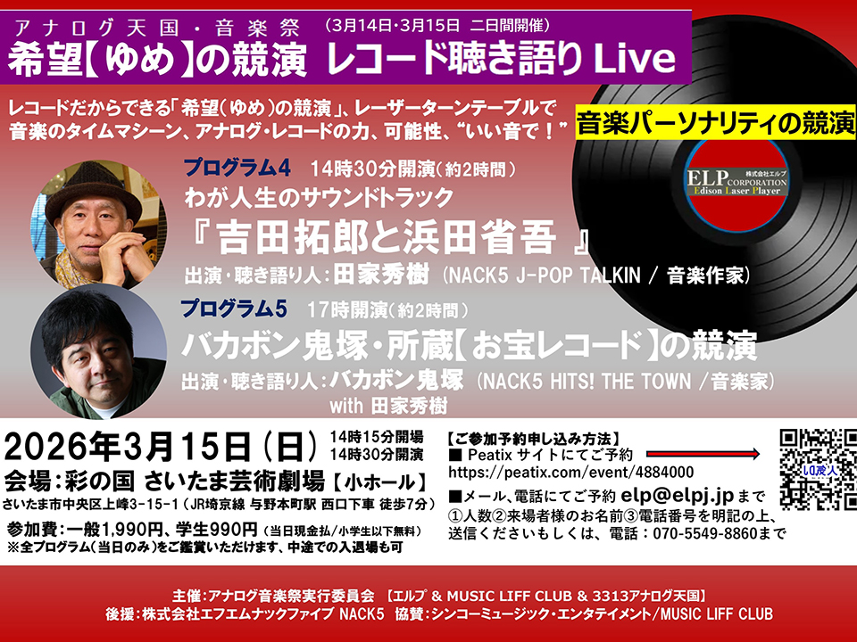15日は “音楽パーソナリティの競演” と題して、NACK5で番組を持つパーソナリティのお二人が登壇。音楽作家の田家秀樹氏は『吉田拓郎と浜田省吾』を聴き語り、音楽家のバカボン鬼塚氏は所蔵している “お宝レコード” を紹介する。どちらも素晴らしい音質と音楽の持つ力で、レコードだからできる、希望(ゆめ)のような音楽体験を味わって欲しい。