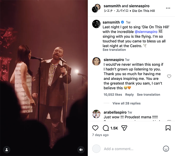 先日シエナはサム・スミスのサンフランシスコ公演にサプライズ登場し、サムと代表曲「Die On This Hill」のデュエットを披露。サムから「君と歌っていると、まるで空を飛んでいるような気分だ」と絶賛され、ますます世界中からの注目が集まるようになった。
