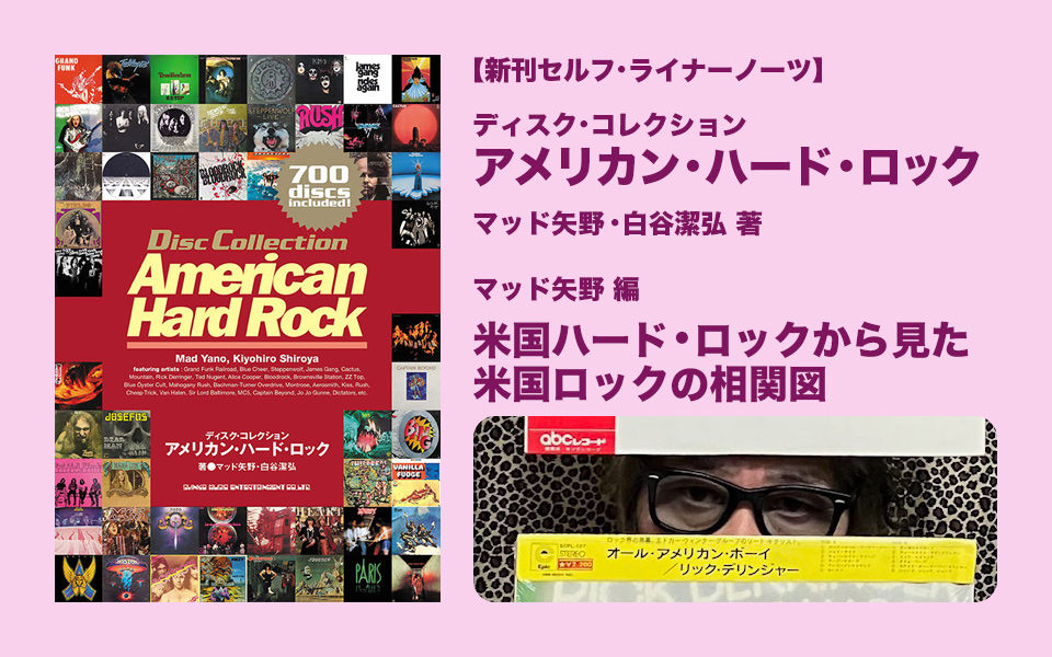 連載「新刊セルフ・ライナーノーツ」ももう第十回を迎えました。今回取り上げる書籍は、本日発売『ディスク・コレクション アメリカン・ハード・ロック』です。復刊を望む声が多かったディスク・ガイドを、今回22年ぶりに全面改稿。ディスクのセレクションから見直して、アメリカ産ハード・ロックの再定義に改めて挑んだ計700枚超を掲載。著者はマッド矢野氏・白谷潔弘氏のお二方によるもので、今回はまずマッド矢野氏による「新刊セルフ・ライナーノーツ」をお送りします。白谷潔弘氏編はたぶん後日別途お送りできると思います!