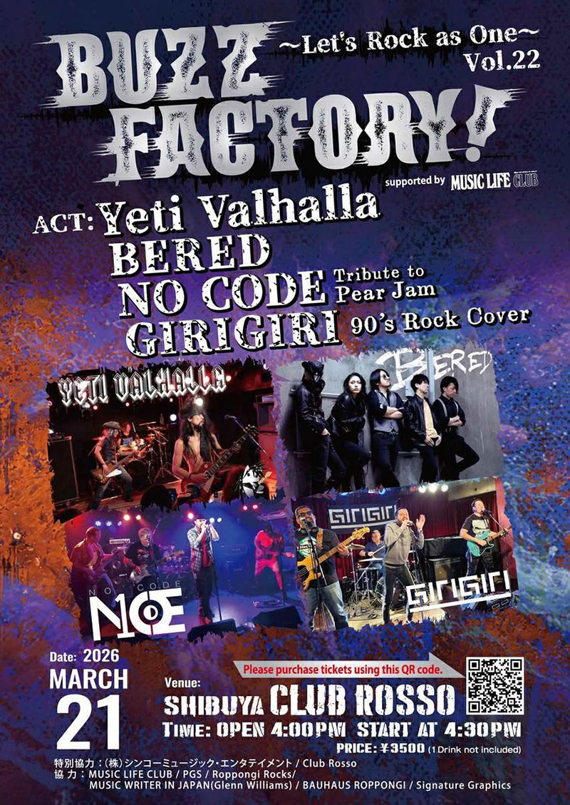 今回の出演はベトナム系カナダ人のヴォーカル&ギタリストのAdam率いる「Yeti Valhalla」、昨年 WILD SIDE TOKYOにてレコ発ワンマンを大成功させた正統派ハードロックバンド「BERED」、在日アメリカ人のScott 率いる Pearl Jam のトリビュートバンド「NOCODE」、90年代ロックを中心にカバーしている在日アメリカ人のTom 率いる「GIRIGIRI」の4バンド。国際色豊かな4バンドの競演をお楽しみに!