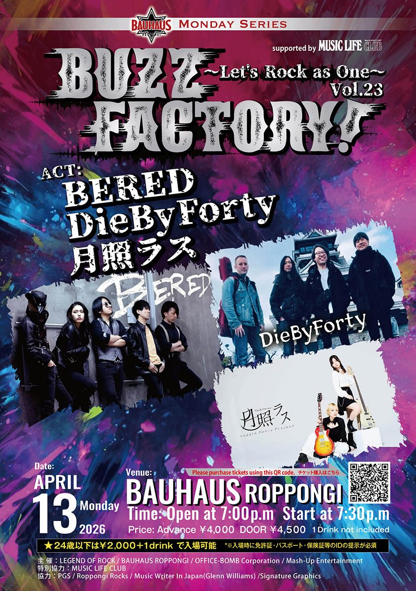 国内外のインディーズ・バンドを応援する「Buzz Factory~Let's Rock as One~ Vol.23」supported by MUSIC LIFE CLUB は4/13(月)六本木BAUHAUS にて開催! 国内外で上昇気流に乗る「BERED」「月照ラス」「DieByForty」の3バンドが出演します。