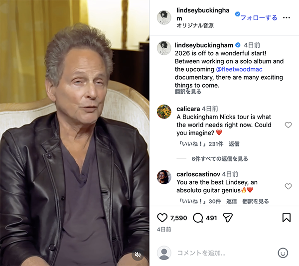 前述のSNSに投稿した動画の中で、バッキンガムはファンに向け、自身の近況を伝えています。「2026年はきっと凄く興味深い年になると思うよ、ワシントンでは色々起こってるけどね。きっと凄く充実した良い年になると思う。いや、と言うより、むしろワシントンでああいうことが起こっているからこそ、かな。それでも僕は相変わらず自分のクリエイティヴ・ライフにしっかりと根を張っていて、ここ2年ほどは新作のソロ・アルバムに取り掛かっているよ」