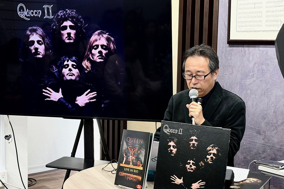 そして、第二部はイベント前日にリリースされたばかりの『QUEEN II コレクターズ・エディション』の(おそらく)世界最速レヴュー。まずは、未発表曲として収録された「ノット・フォー・セール(ポーラー・ベア)」と、その原曲である前身バンド “スマイル” のヴァージョンを聴き比べて、興味深い相違点を指摘した。続いてアルバムで使用された3つの重要な楽器 “ハルフレッド・ギター” “カスタネット” “スタイロフォン” について、どの曲のどこで使用されているかを音を聞きながら解説。マスタリングで音がクリアになったので、よりわかりやすく聞き取れるとのこと。そして、アルバム・クレジットから、もう一人のプロデューサーとしてクレジットされているロビン・ジェフリー・ケイブルに関しての考察。彼がクイーンのデビュー直前、フレディが変名(ラリー・ルレックス)でリリースしたシングルのプロデューサーだったことや、フィル・スペクター・サウンドとの関係を掘り下げた。最後は、ブライアンの担当楽器クレジットに書かれた謎の “BELLS” に関して、演奏した “BELLS” が(のど自慢の合否で鳴らされる)“チューブラベル” であることと使用箇所を特定。クイーン・サウンドの奥深さとこだわりを解説した。