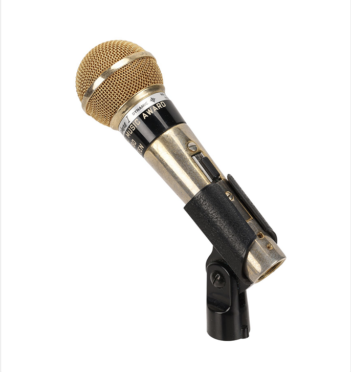 ヒンス・コレクションの中でも特筆すべきは、フレディ・マーキュリーのトレードマークだったシュアー社の565SDマイクロフォンを、通常のシルヴァーではなくゴールド・クローム仕上げにしたもの。これはクイーンが1980年にシュアー社/『サーカス』誌から、年間最優秀バンド賞を贈られた際にマーキュリーがトロフィー代わりに受け取ったもので、ボディ部分にもその銘が入っています。このマイクは実際のライヴでは使用されることはありませんでしたが、1982年にクイーンが『トップ・オブ・ザ・ポップス』に出演し、「Las Palabras de Amor(The Words of Love)」(アルバム『Hot Space』収録)を披露した際に使われました(ちなみにTOTPのパフォーマンスは常に口パクがお約束)。ヒンスは当時マーキュリーのパーソナル・ローディーを務めており、マーキュリーは「お前は僕のマイクの面倒を見てるんだから、この賞はお前が受け取るべきだよ」と言って、気前よくこのマイクを彼にプレゼントしてくれたのだそうです。