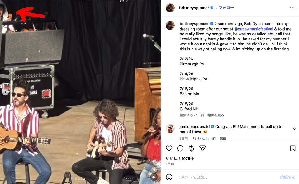 ところがある晩、彼女が自分のセットの後で楽屋に戻っていると、ディランが彼女の楽屋に顔を出し、思いがけず1対1で顔を合わせることになったのです。「彼は私の曲が本当に好きだと言ってくれたの」と、スペンサーは自身のインスタグラムに投稿し、併せてこの夏にディランとジミー・ヴォーンのオープニングアクトを務めることになったとして、4公演の日程を告知しました。「彼は私の曲のどういうところがいいか、とても詳しく話してくれて、正直私はちょっといたたまれない気持ちになっちゃった。その時に電話番号を聞かれたから、ナプキンに書いて渡したの。でも彼からの電話はなかったわ(笑)。きっとこれ(ツアーの前座依頼)が今の彼の電話の仕方だと思うから、私はそれに最初の呼び出し音で(一も二もなく)応じたのよ」