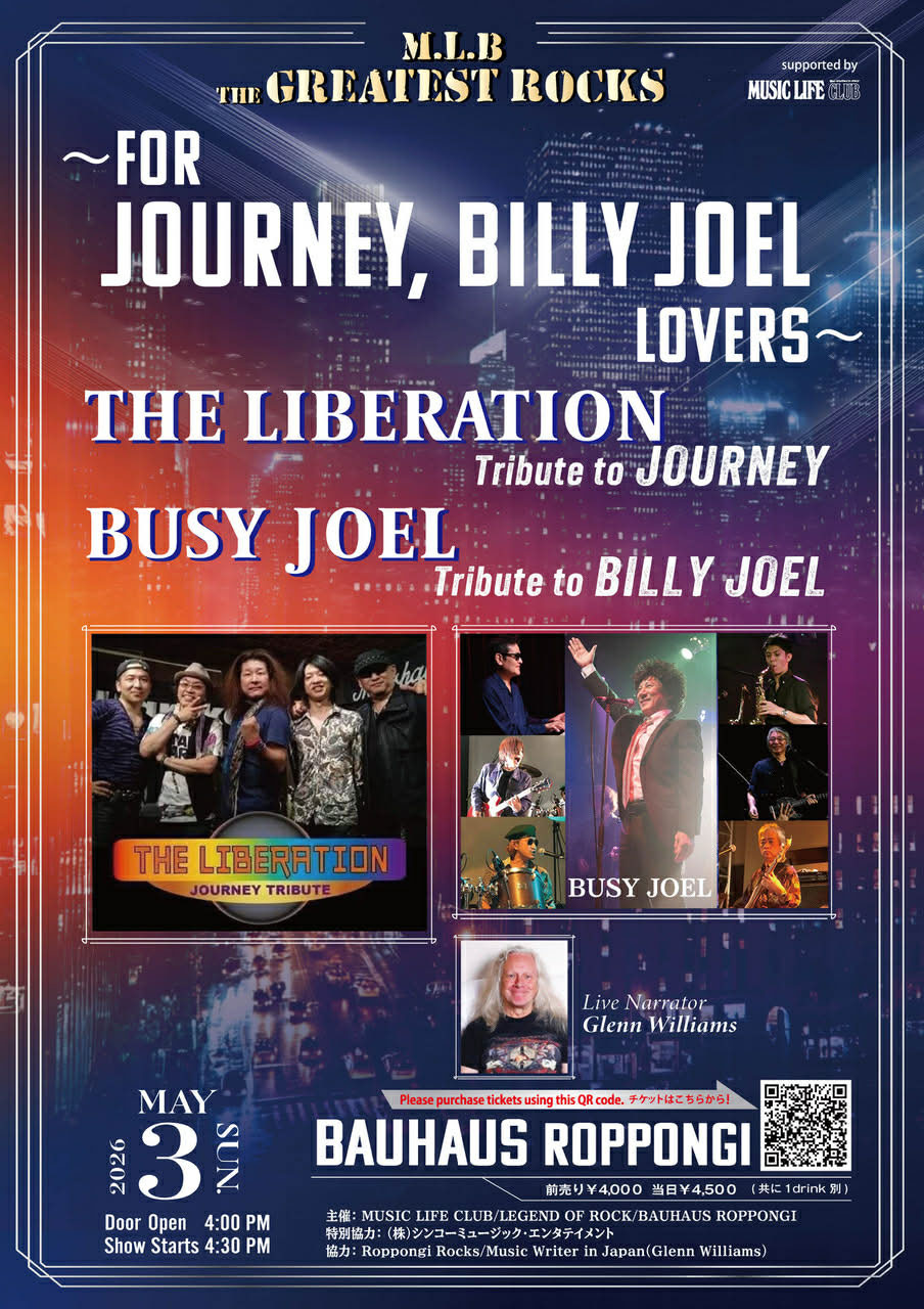 愛と敬意に満ちたトリビュート・バンドが集結するライヴ・イベント「The Greatest Rocks」。5/3(日)の六本木BAUHAUSには、ジャーニー、ビリー・ジョエルという洋楽黄金時代を象徴する2組のトリビュート・バンドが出演!