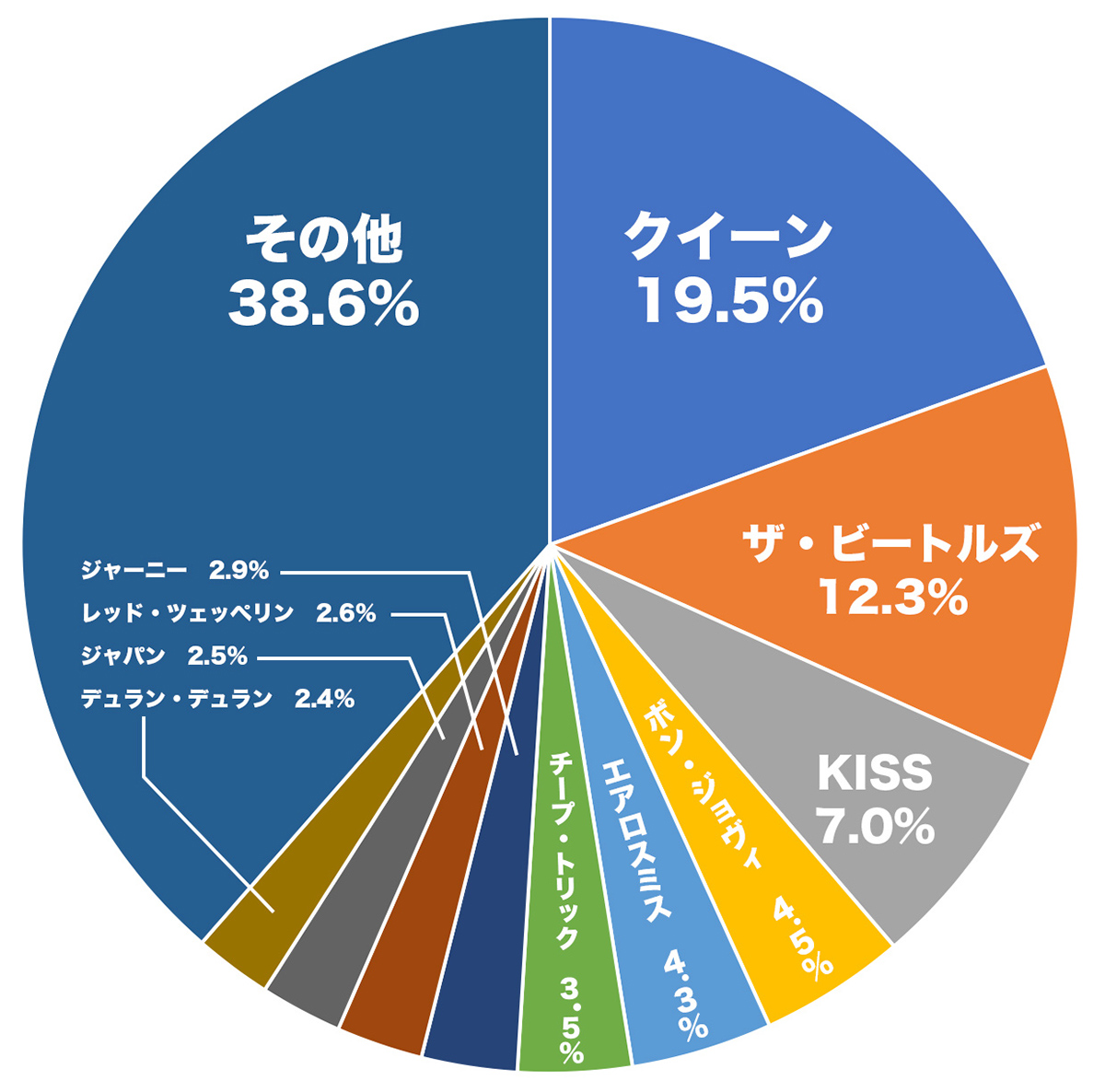 上位3組は至極順当でしたね、はい。しかしクイーンは他を寄せ付けないほど圧倒的かと思いきや、下に円グラフで表しましたが、占める割合は全体の2割弱。彼らを「一番好き」として選んだ方はやはり一番多かったのですが、二番目、三番目の推しとしてクイーンを選んだ方も多く、みなさん案外冷静なんだなと感じました。反射的に選んだというよりは、ちゃんと考えて順序を決めたんだろうなという印象があります。勝手な想像ですが、クイーンを「一番好き」で選んだ方には映画『ボヘミアン・ラプソディ』以後の新し目のファンの方が多く、二番目・三番目に選んだ方は、「クイーン熱に罹ってもうかれこれ40年ほど」というベテランが多いのでは?、と。いかがでしょう。